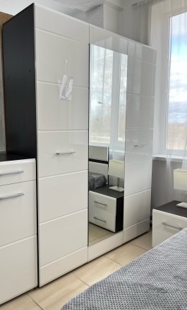Во внешнем виде некоторых шкафов можно выделить полку для обуви, расположенную в его низу, либо открытые полки для размещения фото или книг. Зеркало, размещенное на дверце шкафа, поможет сделать комнату, в которой он будет установлен, объемнее. Есть шкафы, в которых зеркалами отделаны сразу несколько створок дверей.